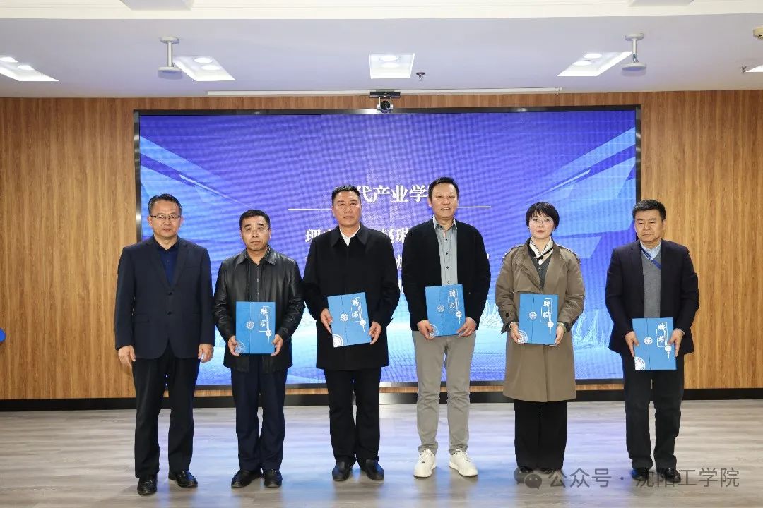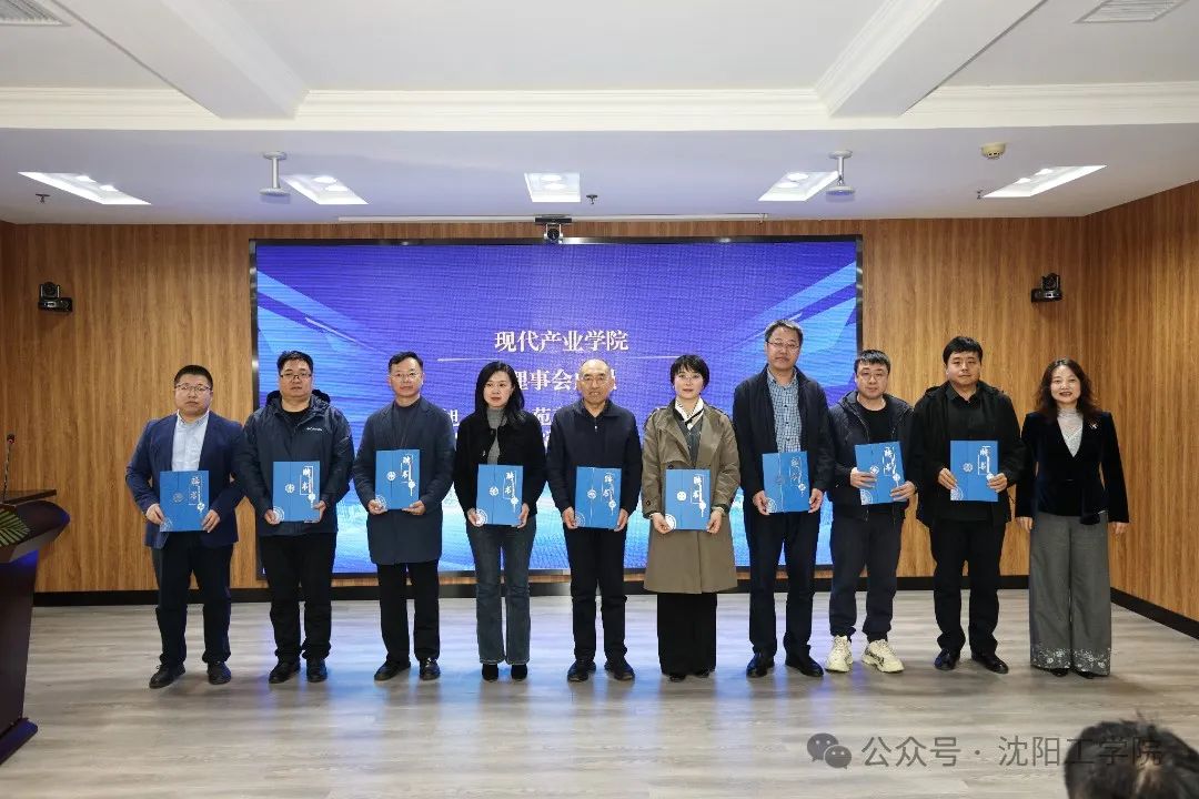 李康举为现代产业学院理事长、副理事长、秘书长颁发聘书。杨秀英为现代产业学院理事会成员颁发聘书。